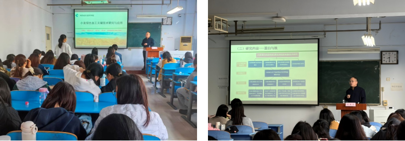 张康逸研究员立足国家粮食安全与国民健康两大核心需求,阐释了小麦绿色加工技术的时代价值与现实意义。结合民生热点深入剖析主食营养升级与功能化创新的迫切性,明确以精准营养为导向的小麦加工技术,既是筑牢粮食安全底线的重要支撑,也是落地健康中国战略、赋能食品产业高质量发展的关键路径。他详细介绍团队在抗性淀粉制备与改性领域的深耕成果,系统讲解了多项创新技术,通过精准调控淀粉结构与消化特性,为研发低升糖、高适配全人群的营养面制品夯实技术根基;同时分享小麦功能肽制备等前沿突破,全面展现小麦蛋白高值化利用、特色功能食品开发的创新方向与广阔应用前景。互动交流环节同学们踊跃提问,张康逸研究员耐心答疑,结合科研与产业经验,为大家的科研方向与成长发展给出务实可行的建议。