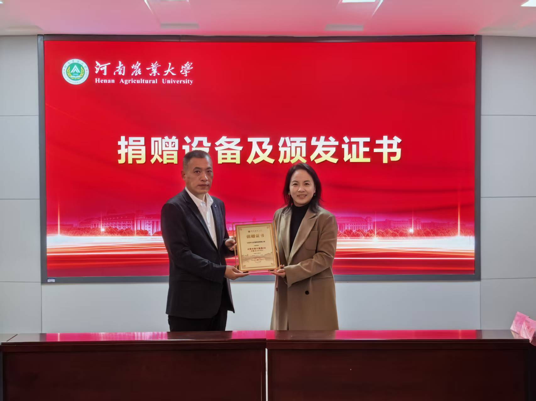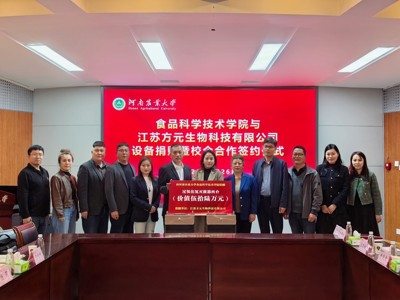 随后,双方举行了捐赠仪式。李磊代表江苏方元生物科技有限公司向学院捐赠了一批先进实验室消毒设备,王燕萍向企业颁发了捐赠证书,对企业的善举予以充分肯定。