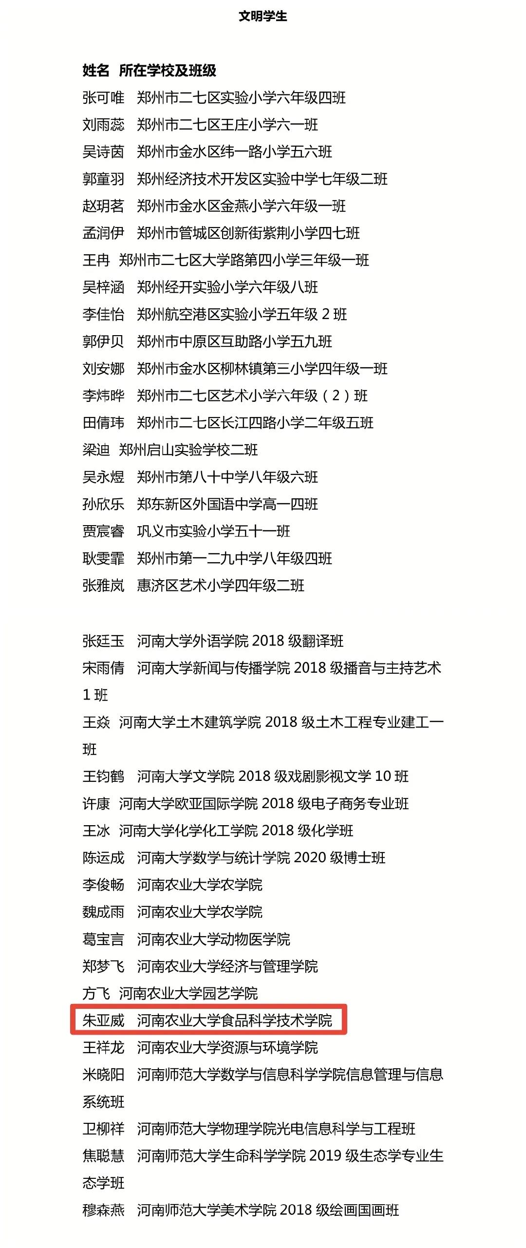 朱亚威荣获“河南省文明学生”荣誉称号。