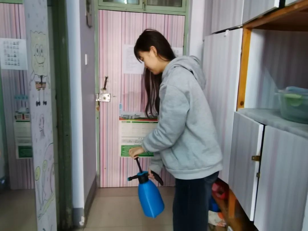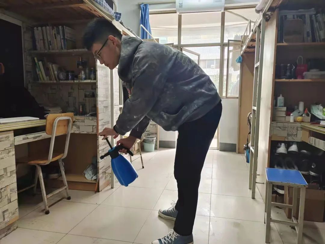 同时,在学院老师的引导下对宿舍进行消毒杀菌,从门口到窗台,从床底到床上,避免细菌滋生,阻断病毒传播。