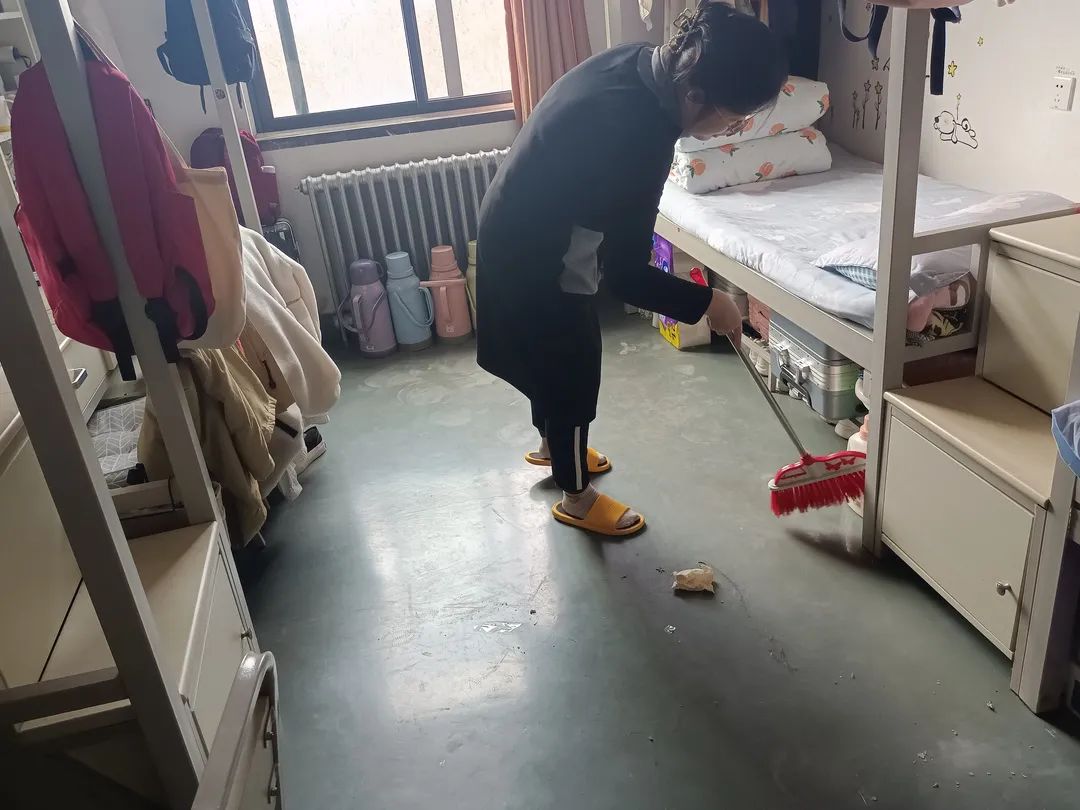 新冠疫情防控形势逐渐严峻,同学们听从学院安排,积极投入宿舍大扫除活动,热情高涨、相互合作,一起收拾床铺、整理书桌、清理垃圾、扫地拖地等。同学们严格按照学校疫情防控工作要求,做好宿舍卫生的清洁,全覆盖消除卫生死角。