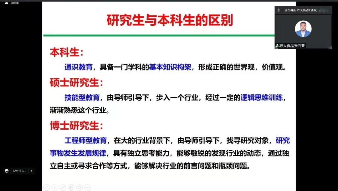 张西亚强调,本科生与硕士研究生间有着本质的区别,本科生属于通识教育,需要掌握基本的知识架构,而硕士研究生要求同学们有较好的逻辑思维和实验技能,在导师的引导下,进入并熟悉一个具体的行业。他表示,同学们对自己要有清晰的认知,并对未来做好合理的规划,最后,他为同学们送上祝福,希望所有同学都能成就更好的自己。