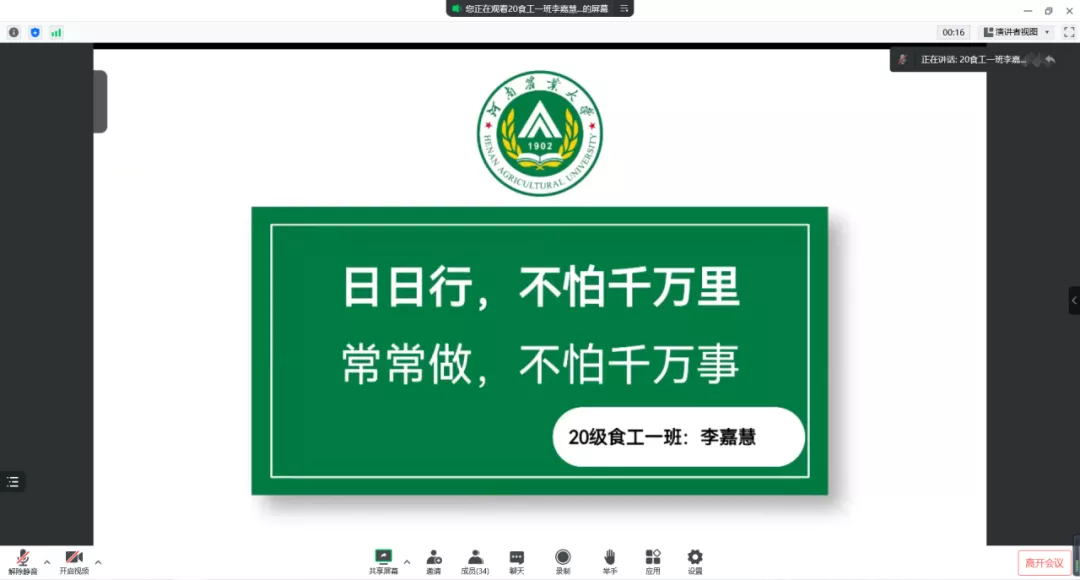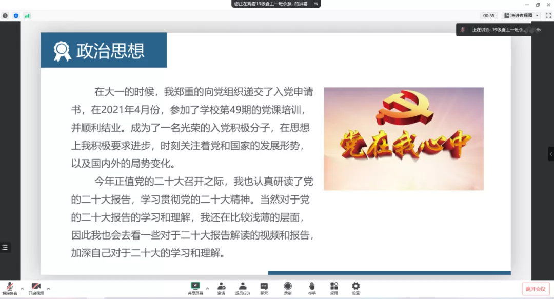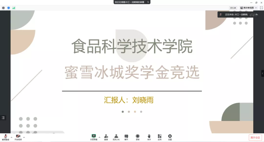 绩点成绩和综合成绩均排名年级前20%的同学在规定的时间内提交申请表和成绩单报名参加,经复核筛查后符合条件的同学进入面试环节。会上,各年级候选人按照顺序依次进行两分钟的PPT展示发言。同学们分别从个人简介、社会实践、学习成绩、校内外荣誉等多方面进行汇报。整个评选过程有条不紊,同学们用激昂的演讲展示出他们积极向上、锐意进取的青春风采。评审老师们认真听取汇报,结合同学们的材料进行综合打分,并在会后进行名单公示。