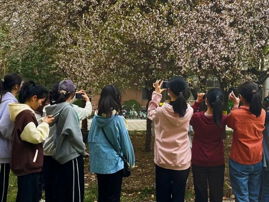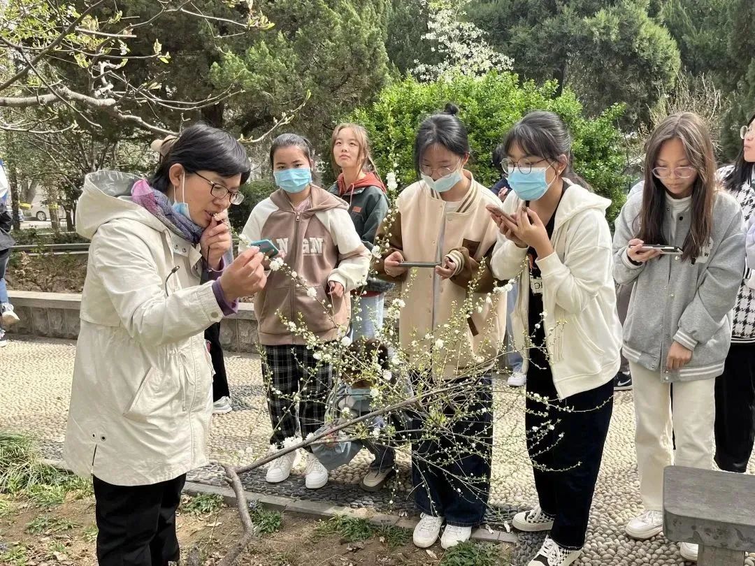 学生沿小路对校园内的植物进行详细讲解和鉴赏,她给同学们普及了各类植物生长的具体环境和各自开花的时节与特点,从玉兰花的各式各样到紫荆花的开满枝干,再到含苞待放的牡丹。蓦然回首,发现三号楼前的樱花小道成了校园内最靓丽的风景线。