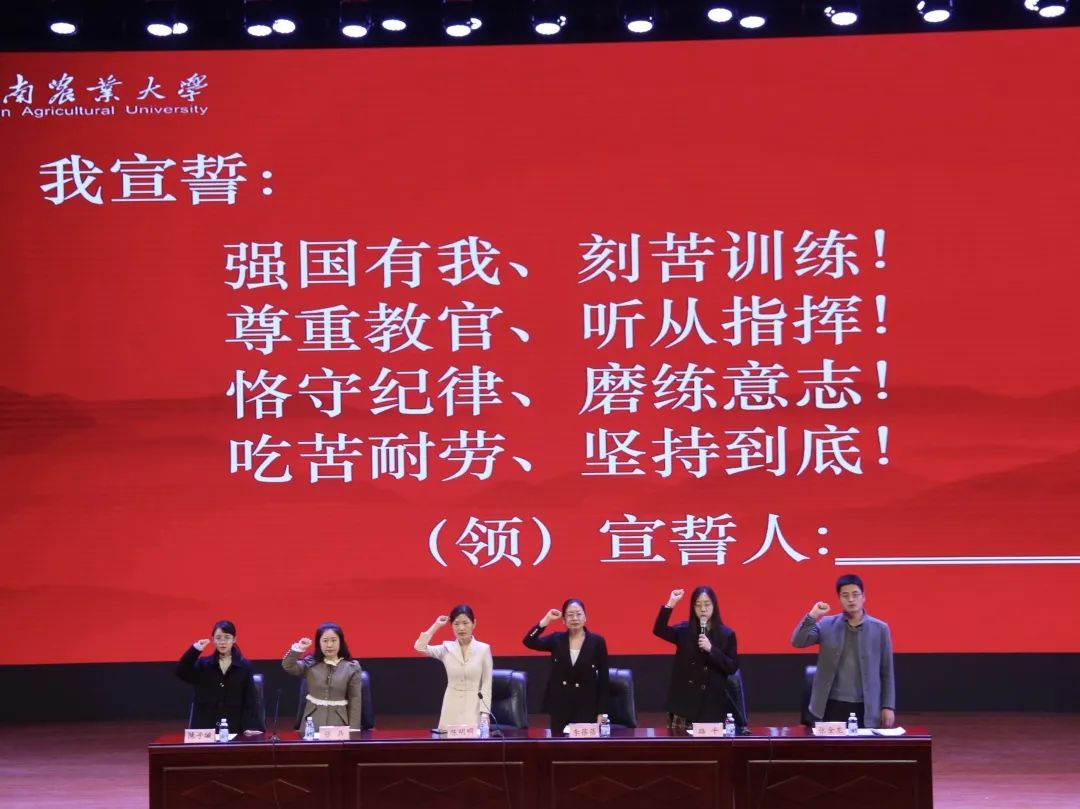 陈明明结合时事向同学们强调了军训和大学军事教育的重要意义,她表示,军训是落实“立德树人”任务的根本要求,同学们应该将小我融入到大我之中,听从指挥,向学院交上一份满意的答卷。会议最后,路平带领全体参训学生庄严宣誓。