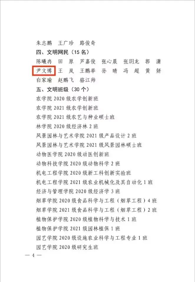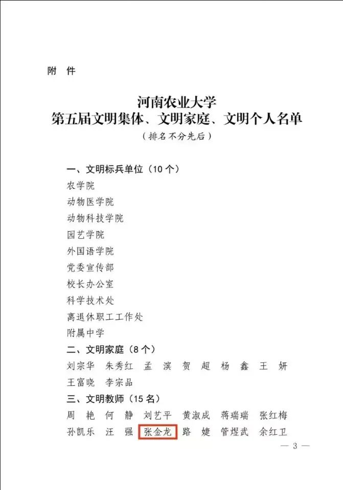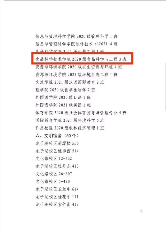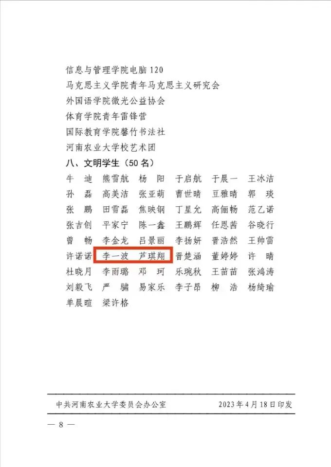 第五届文明集体、文明家庭和文明个人的决定》(农大党文〔2023〕22号)。院团委副书记张金龙荣获“文明教师”荣誉称号,2020级食品科学与工程3班荣获“文明班级”荣誉称号,桃李园学生公寓2#326、9#308-1、文化路校区31#615荣获“文明宿舍”荣誉称号,尹文博荣获“文明网民”的荣誉称号,李一波、芦琪翔荣获“文明学生”荣誉称号。
