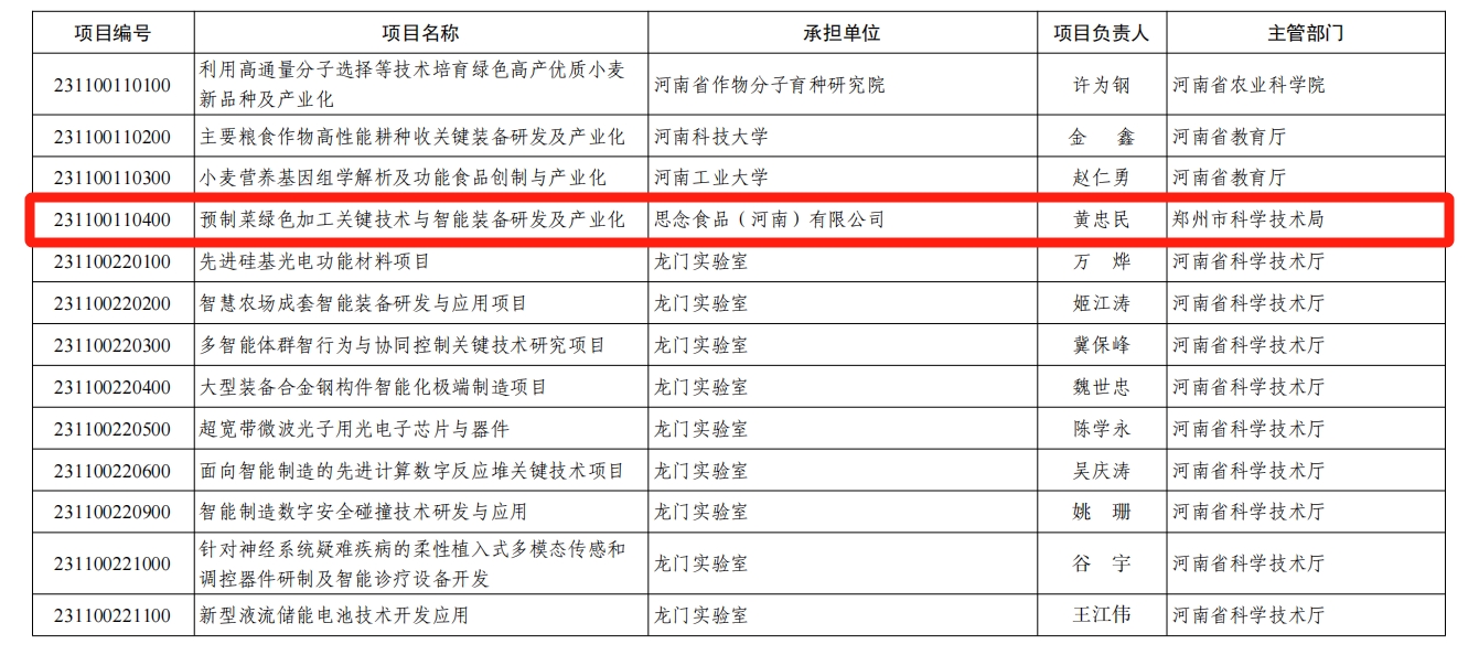 根据《河南省2023年第二批科技发展计划下达通知》(豫科[2023]135号),免费色情片 二级教授、教授级高工黄忠民主持的河南省重大科技专项“预制菜绿色加工关键技术与智能装备研发及产业化”获批立项(项目编号:231100110400)。项目财政经费1000万元,研究期限3年,参加单位包括思念食品(河南)有限公司、千味央厨、九豫全等预制菜产业头部企业,以及郑州轻工业大学、北京工商大学、中原食品实验室等十余家科研单位。
