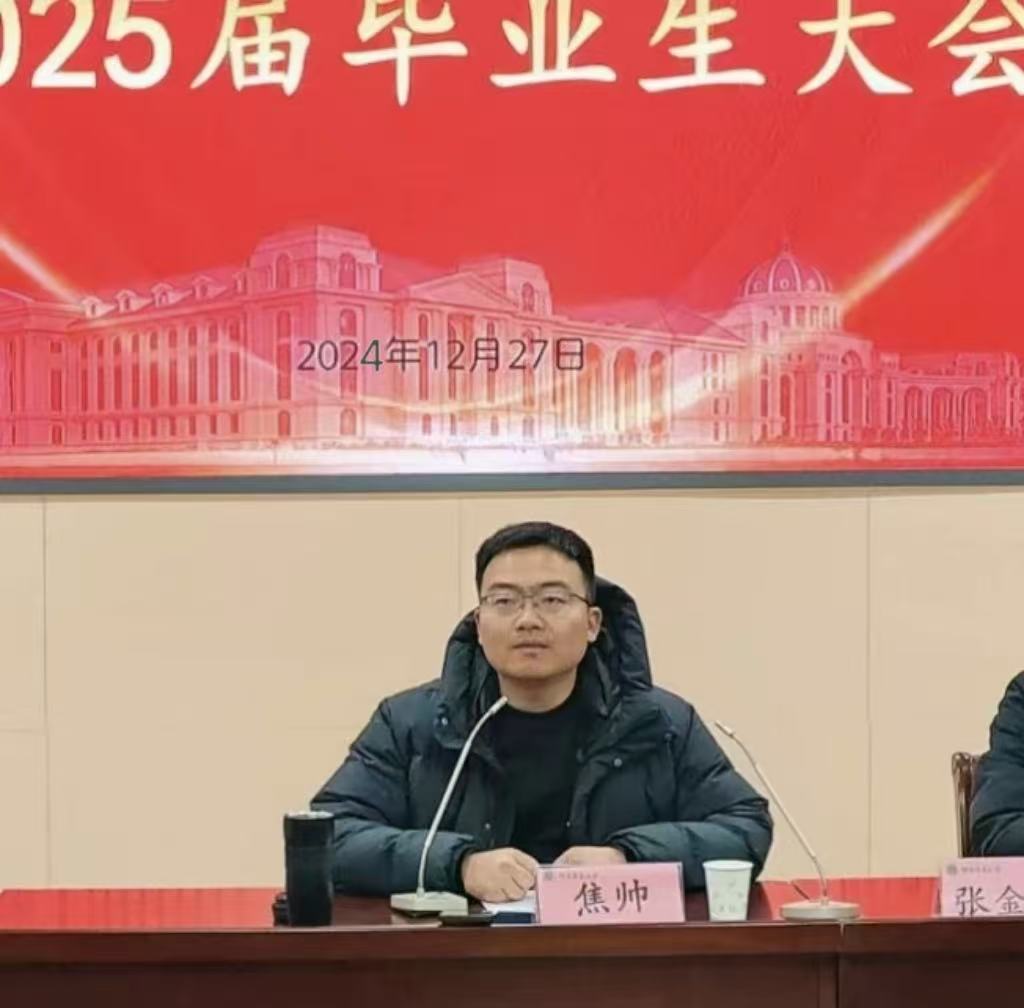 于文化路校区三百人报告厅召开2025届毕业生大会,院党委副书记焦帅、2025届毕业生辅导员张金龙出席,2025届全体毕业生参加。