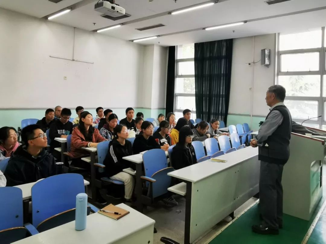 关工委阳光督导刘波涛教授在工程楼208教室为2019级新生作劝学报告,学院师生代表参与会议。