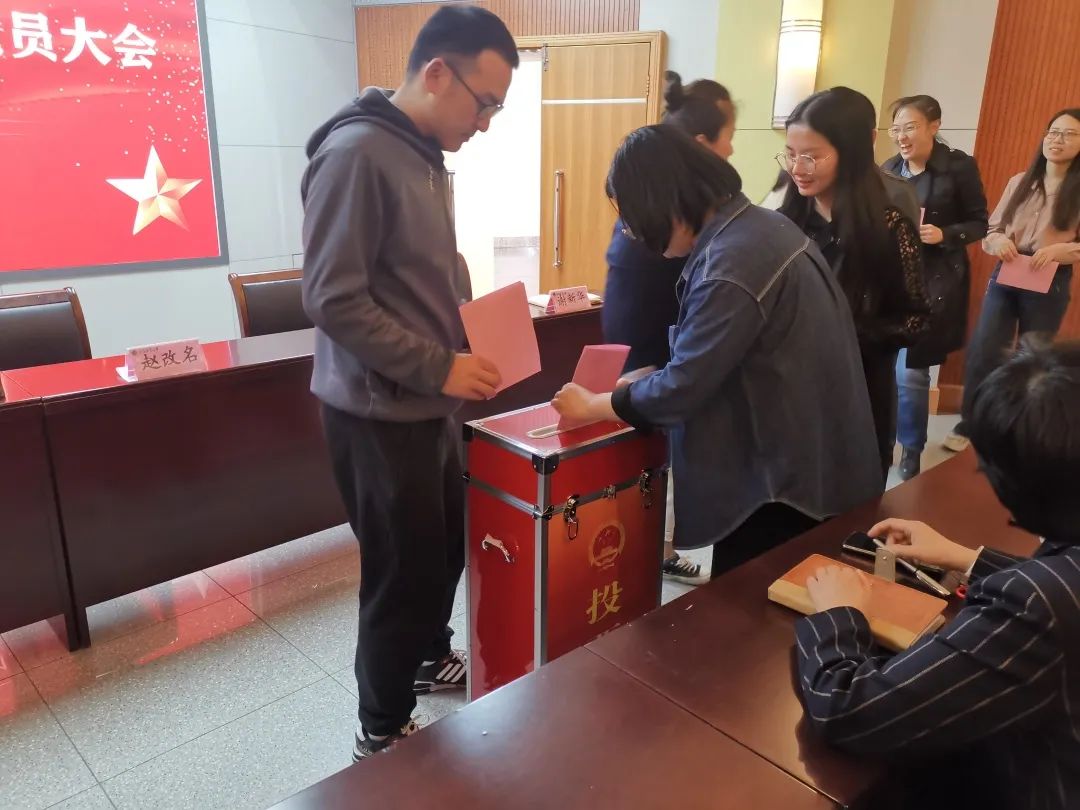 随着主持人安排,监票人、计票人就位开始进行选举工作。各位党员收到选票后进行填写并投票。