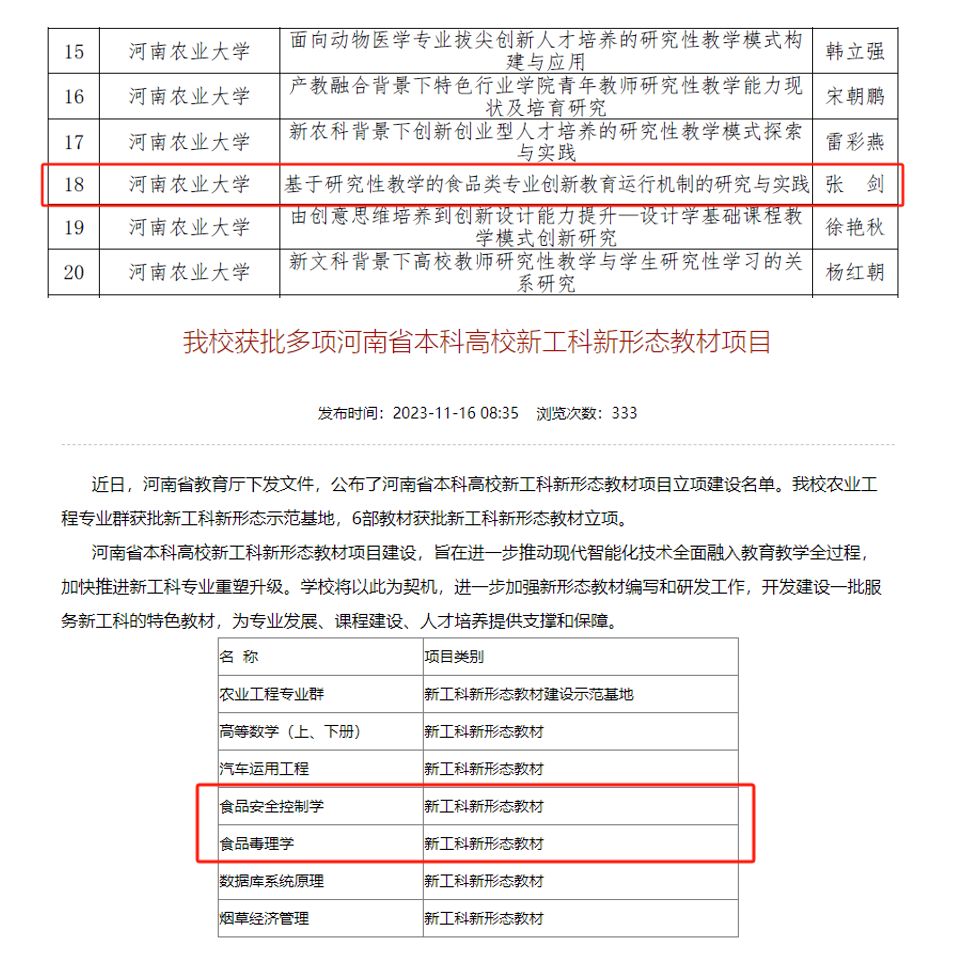 学院获批河南省研究性教学改革项目1项,河南省教育科学研究项目1项,河南省创新型人才培养典型案例1项,与河南天香面叶食品有限公司共建河南省本科高校大学生校外实践基地项目1项。获批免费色情片 揭榜挂帅项目1个、重点项目2个、青年项目11个。《食品安全控制学》、《食品毒理学》获批河南省本科高校新工科新形态教材项目。免费色情片 教师主编、参编教材10余部,发表教改论文30余篇。